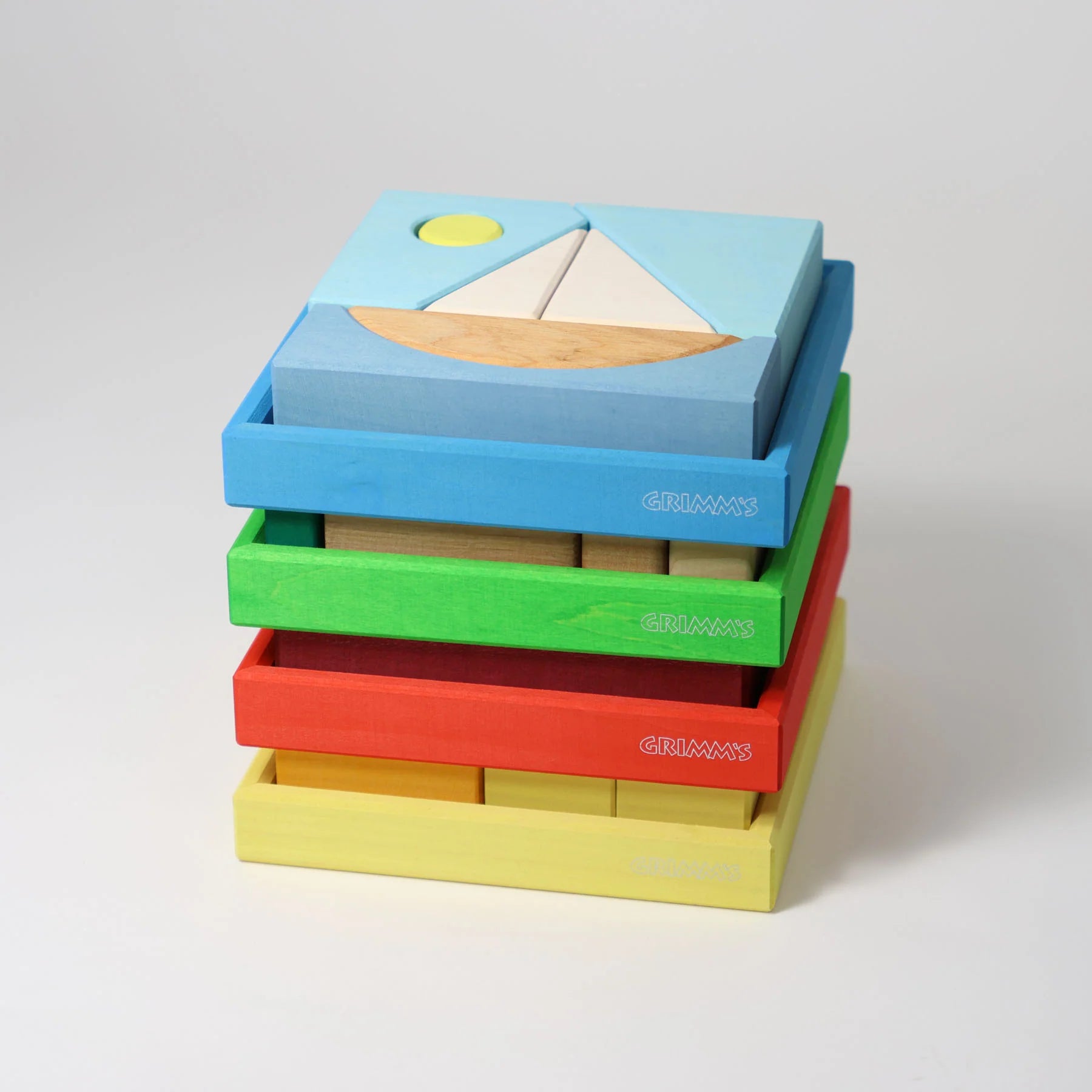 Green like ... the forest Surrounded by the lush green of the leaves, the squirrel feels safe and secure. Outside the frame, the different building blocks become jungle-like dinosaur landscapes. Building Set Green is part of our four Colour Building Sets. With their large pieces, they are made for the smallest hands. The colour variations provide a first introduction to the primary and secondary colours and their different effects. Wood: Lime wood colour glazed, alder wood oiled Frame: 18.6 x 18.6 cm Building blocks: 4 cm thick