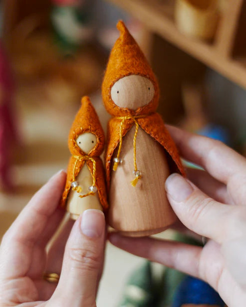 Meet our enchanting handmade wooden gnomes, a delightful companion for small world play that captivates both young children and the young at heart. Crafted in the USA from natural wood, this charming Waldorf-inspired gnome wears a hand-stitched wool felt coat with a cotton tie and glass beads — adding warmth and whimsy to every imaginative adventure.
